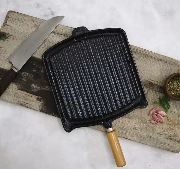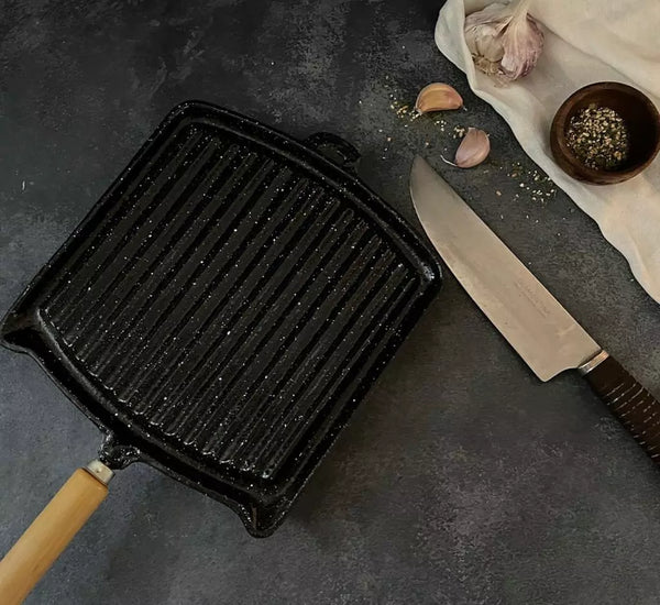 Eleve su cocina al siguiente nivel con esta resistente plancha de acero esmaltado negro sazonado, conocida como "Bifera Cuadrada".